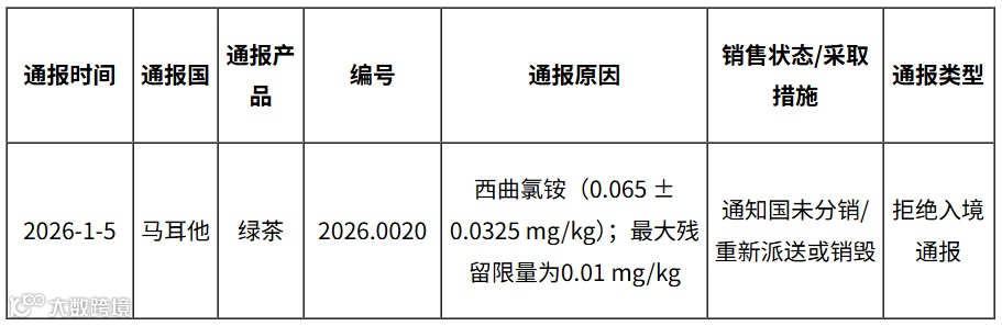 据欧盟食品饲料类快速预警系统(RASFF)消息,2026年1月5日,欧盟通报我国出口绿茶不合格。具体通报内容如下: