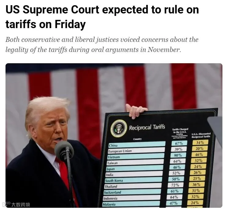 2026年刚开局,关税调整再度密集落地。1月9日(本周五),美国最高法院将对特朗普政府加征的对华关税案作出最终裁决——若裁定违法,现有关税最高可下调20%,部分对美出口企业有望重获成本优势,此前被加征的千亿美元税款亦可能退还。