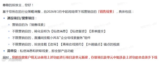 目前部分广告主账户已收到弹窗通知,明确提示“销售线索”目标将于2026年1月中旬起逐步下线。预计至2月中旬,相关功能将在全量账户中完成下线。