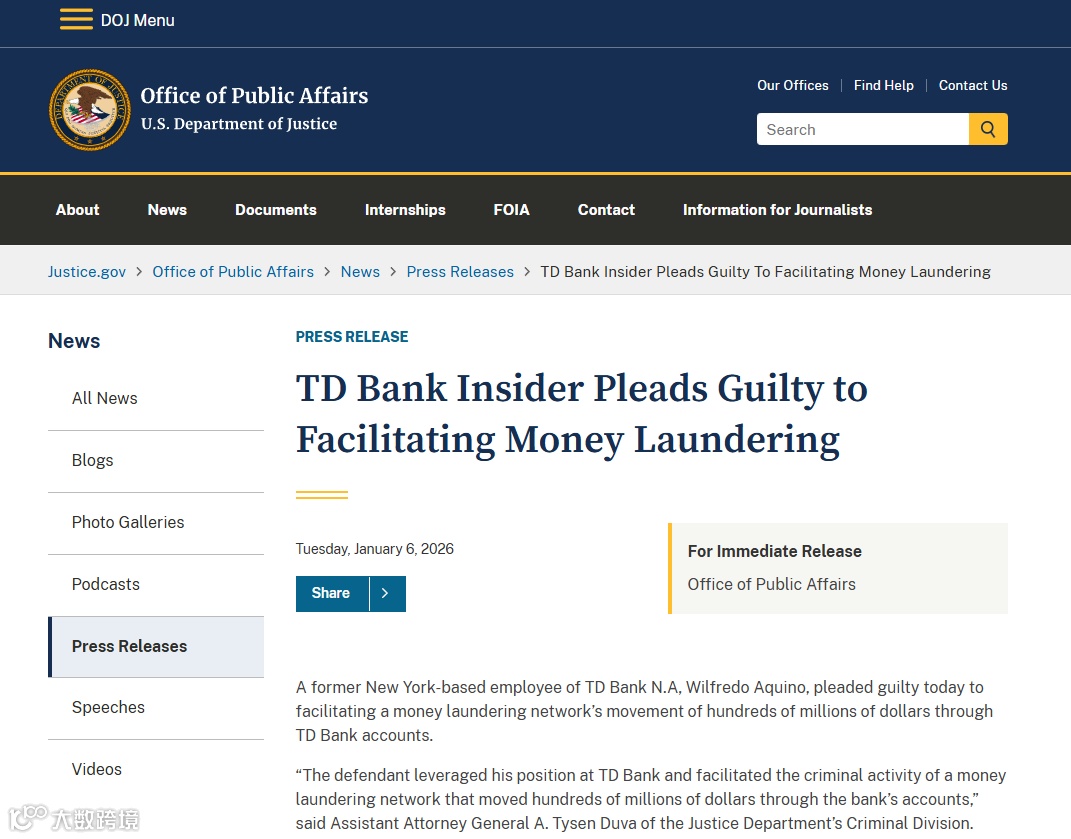 美国司法部披露,道明银行(TD Bank)纽约分行前副经理威尔弗雷多·阿基诺(Wilfredo Aquino)已于1月6日承认“合谋洗钱”指控。他在2019年至2021年2月任职期间,利用职务便利协助名为“David网络”的洗钱组织,通过该行账户转移约4.74亿美元(约合6.4亿加元)资金。