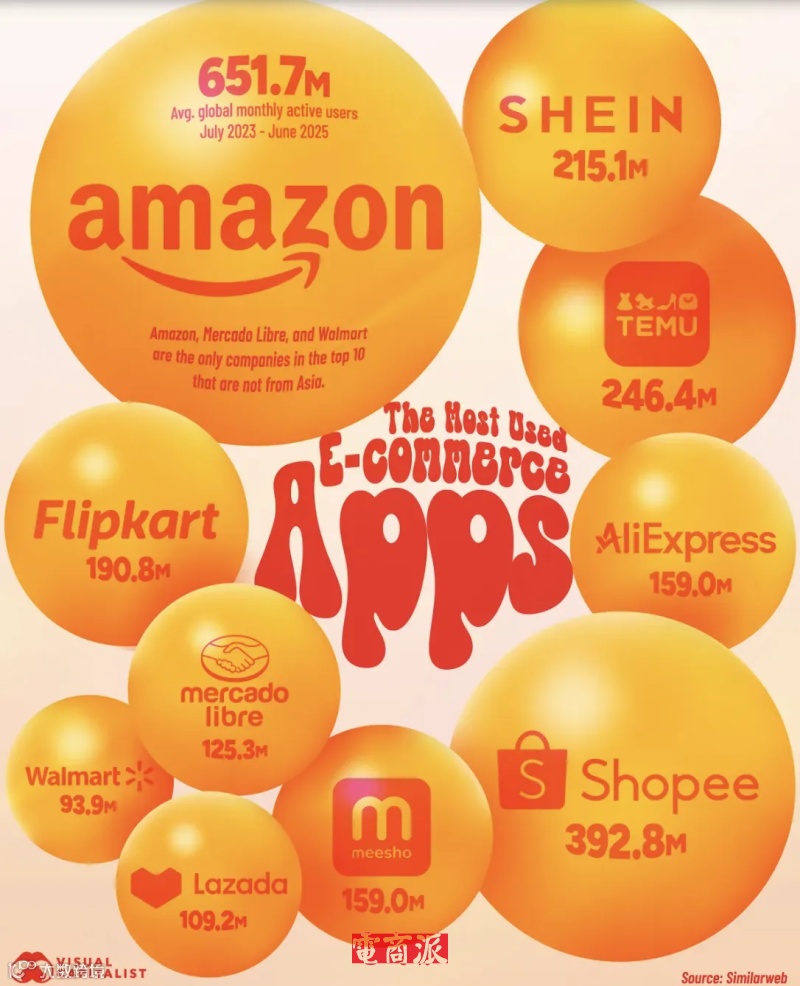 Similarweb最新数据显示,2025年全球前十大电商APP月活跃用户(MAU)合计超20亿。其中,亚马逊以6.517亿MAU稳居第一;Shopee以3.928亿MAU位居第二;Temu以2.464亿MAU排名第三。