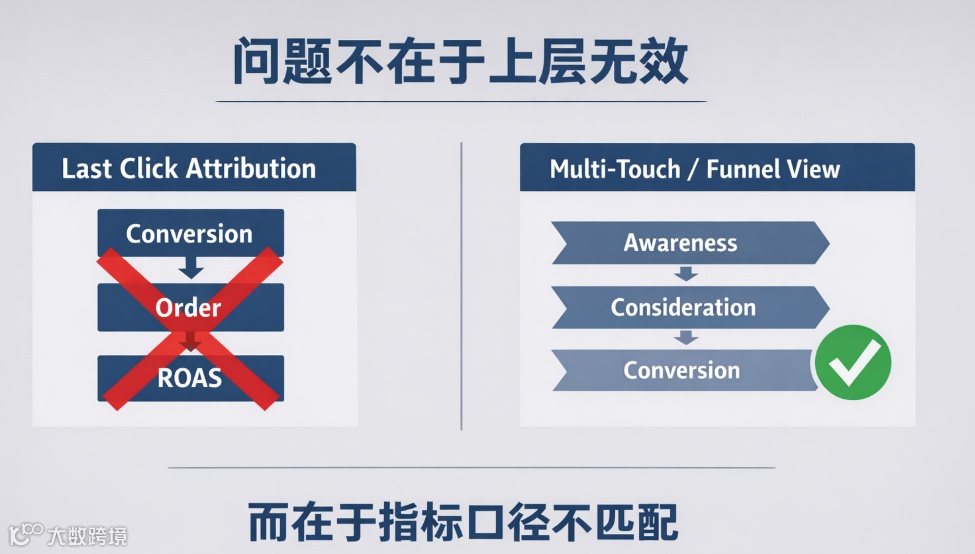 上层流量最常被质疑:“它到底贡献了多少销售?”若仅用末次点击ROAS衡量,结论往往是“贡献很小”。但这并非上层无效,而是指标口径错配:上层解决的是“供给与信任”,而非“即时收银”。