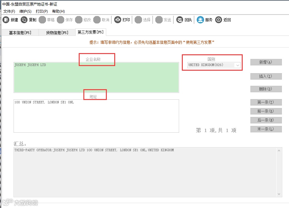 在原产地证书申报中,需明确填写所有非缔约方或第三方企业信息,包括国家/地区、企业名称和地址等详细资料。以下为示例: