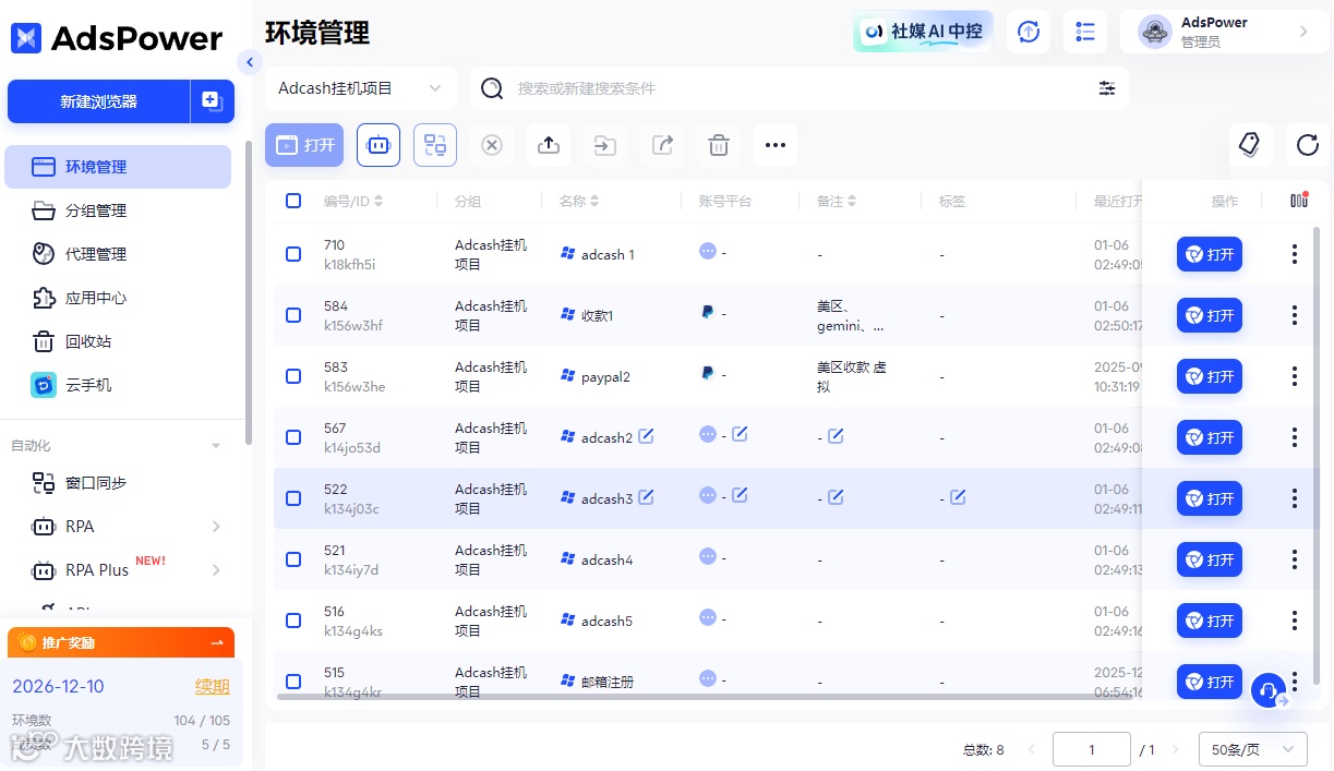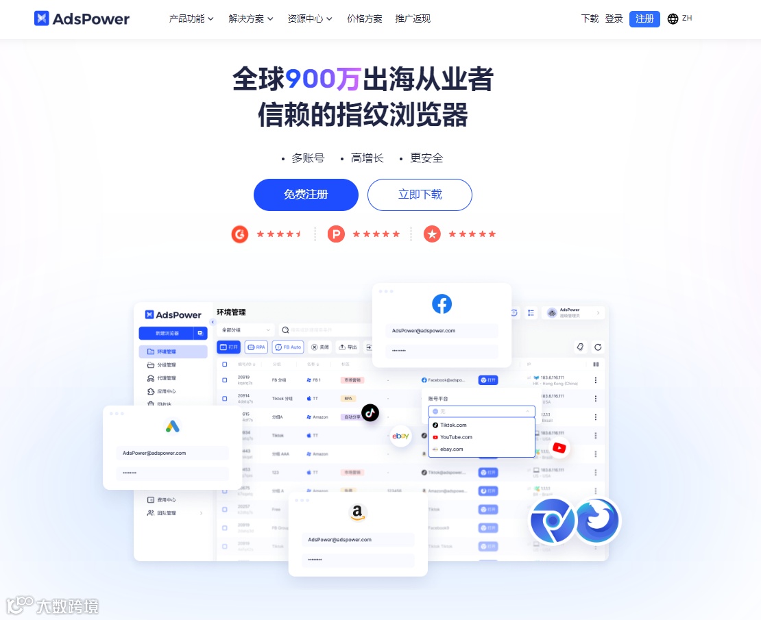 2.指纹浏览器建议选择 AdsPower,它是目前市面上兼容性好、多开顺畅的指纹浏览器工具,能完美模拟不同设备的底层指纹。