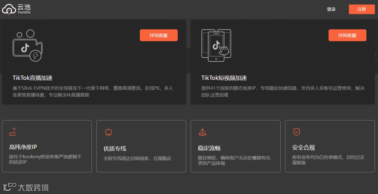 云池TikTok直播加速专线,基于SRv6 EVPN技术的全球直连下一代骨干网络,覆盖高清推流,在线PK、多人连麦等直播场景,专业解决tk直播难题,落点采用高质量静态独享住宅IP,全程专线直达目标国家,合规稳定,让您的TikTok之旅无痛点。