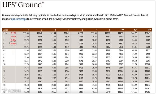 以UPS Ground服务重量段价格表来举例,横轴是分区,纵轴就是重量段,其中1lbs表示的是0-1lb范围,2表示的是1-2lb范围,以此类推,美国一般都是从1到150lb结尾,超过150lb就要按其他的计费方式收费了。