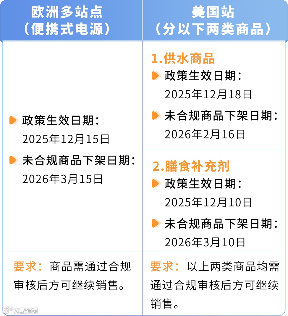 近期,亚马逊向卖家发出合规政策更新通知,涉及便携式电源、供水商品和膳食补充剂三大高敏感品类。相关要求已分批实施,首批关键时间节点如下表所示,请卖家及时核查账户状况,避免因未达标导致下架。