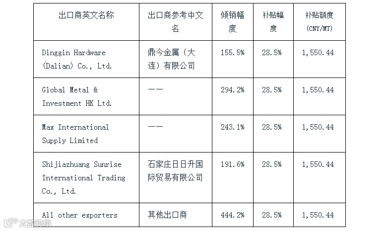 附表:加拿大对华铸铁污水管反倾销税和反补贴终裁税率表