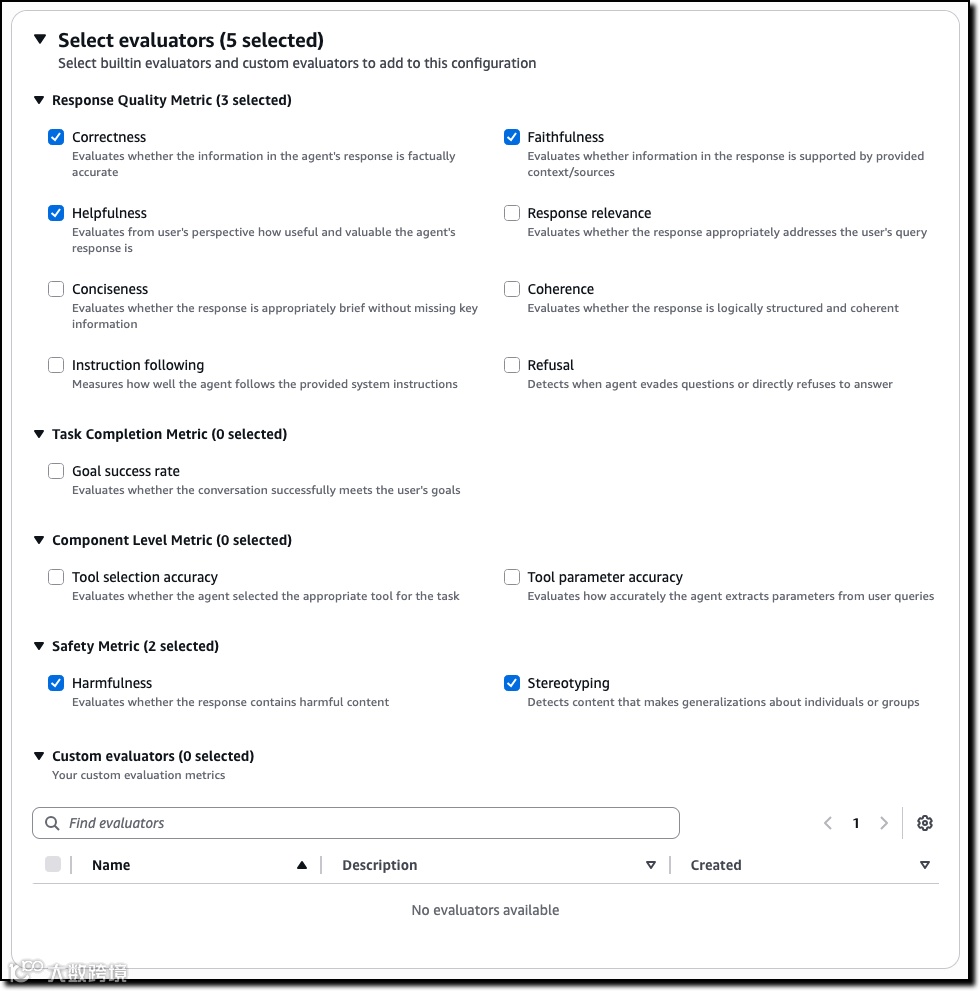 AgentCore Evaluations提供开箱即用的多维评估能力,涵盖正确性、帮助性、工具选择准确率、目标成功率、安全性等通用指标,并支持基于业务场景定制提示词与评分模型。