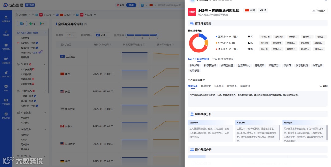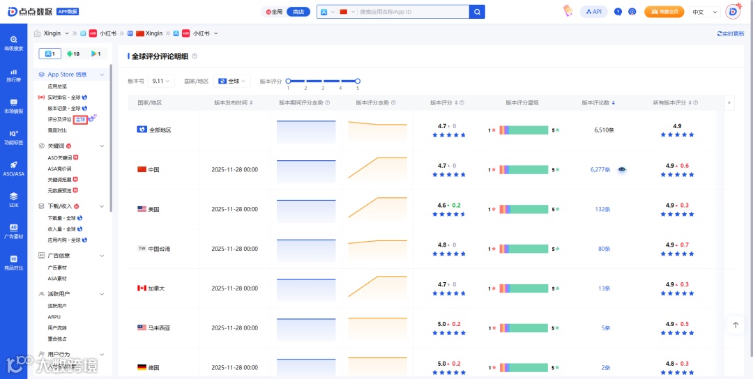 - 精准筛选:按“App版本+国家/地区”双维度查询,获取特定版本在目标市场的评分趋势与评分数;