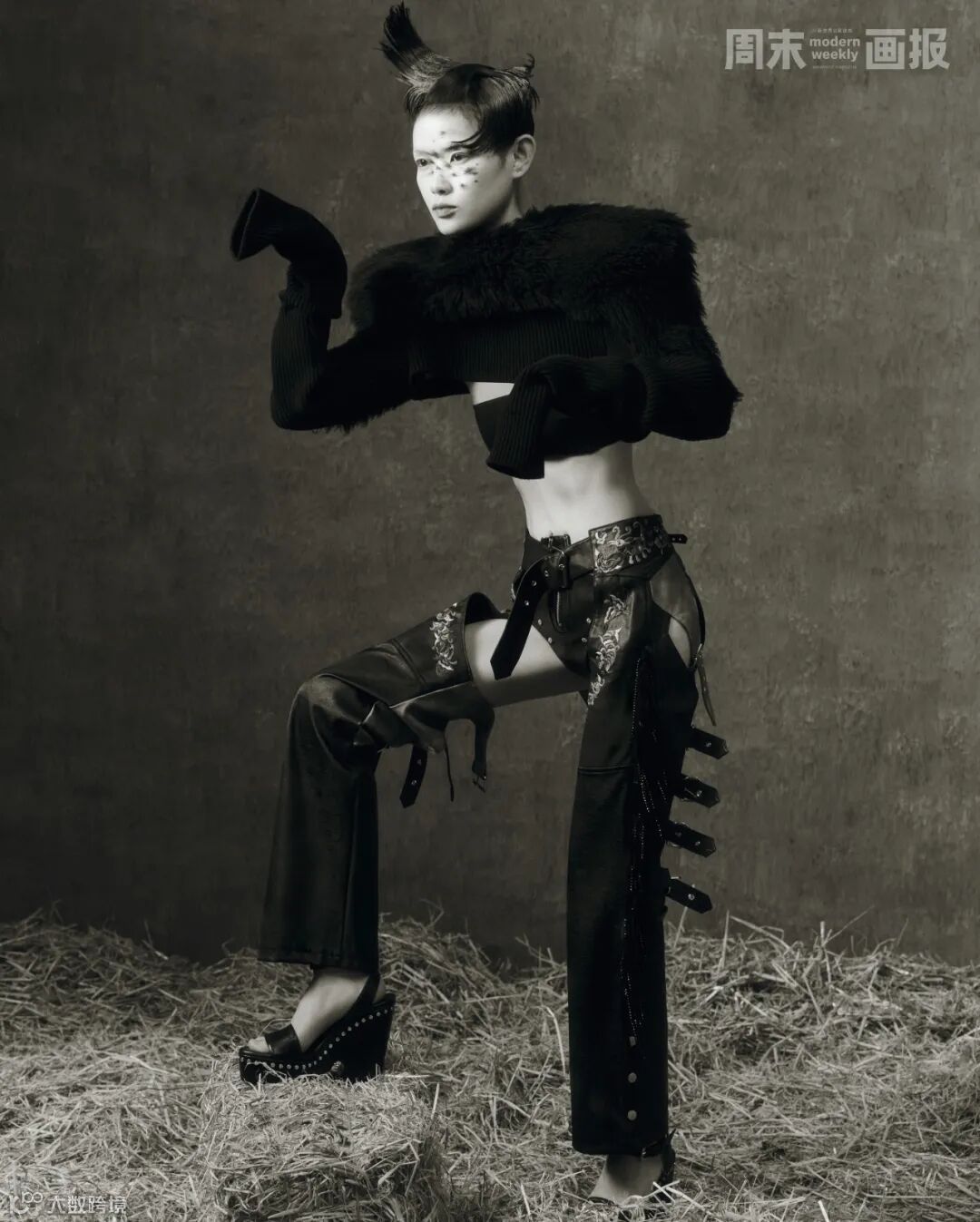 Rick Owens 廓形上衣,022397BLUFF 手工刺绣牛仔骑马流苏皮裤,Didu 黑色皮短裤,Givenchy by Sarah Burton 黑色厚底凉鞋