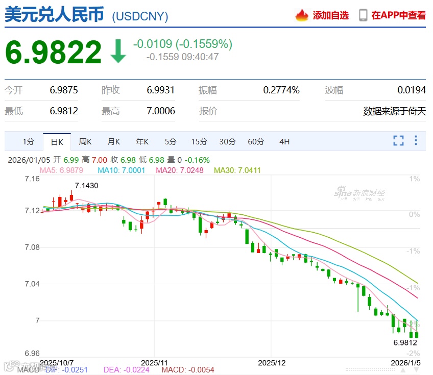 2026年1月1日,美元兑人民币开盘报6.9940,最低6.9864,收盘6.9868;1月3—4日维持高位震荡,汇率稳定在6.9931左右,呈现“围绕7.0窄幅波动、人民币偏强”格局。