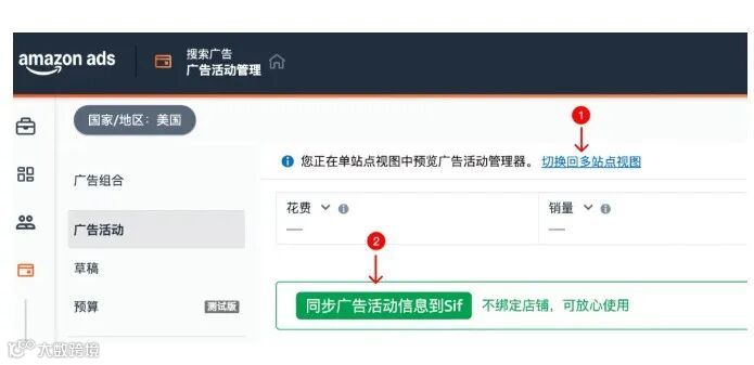 - 完成首次全量同步:进入广告管理页,切换至多站点视图,点击「同步广告活动信息到Sif」;首次使用单站点视图将提示跳转补同步。