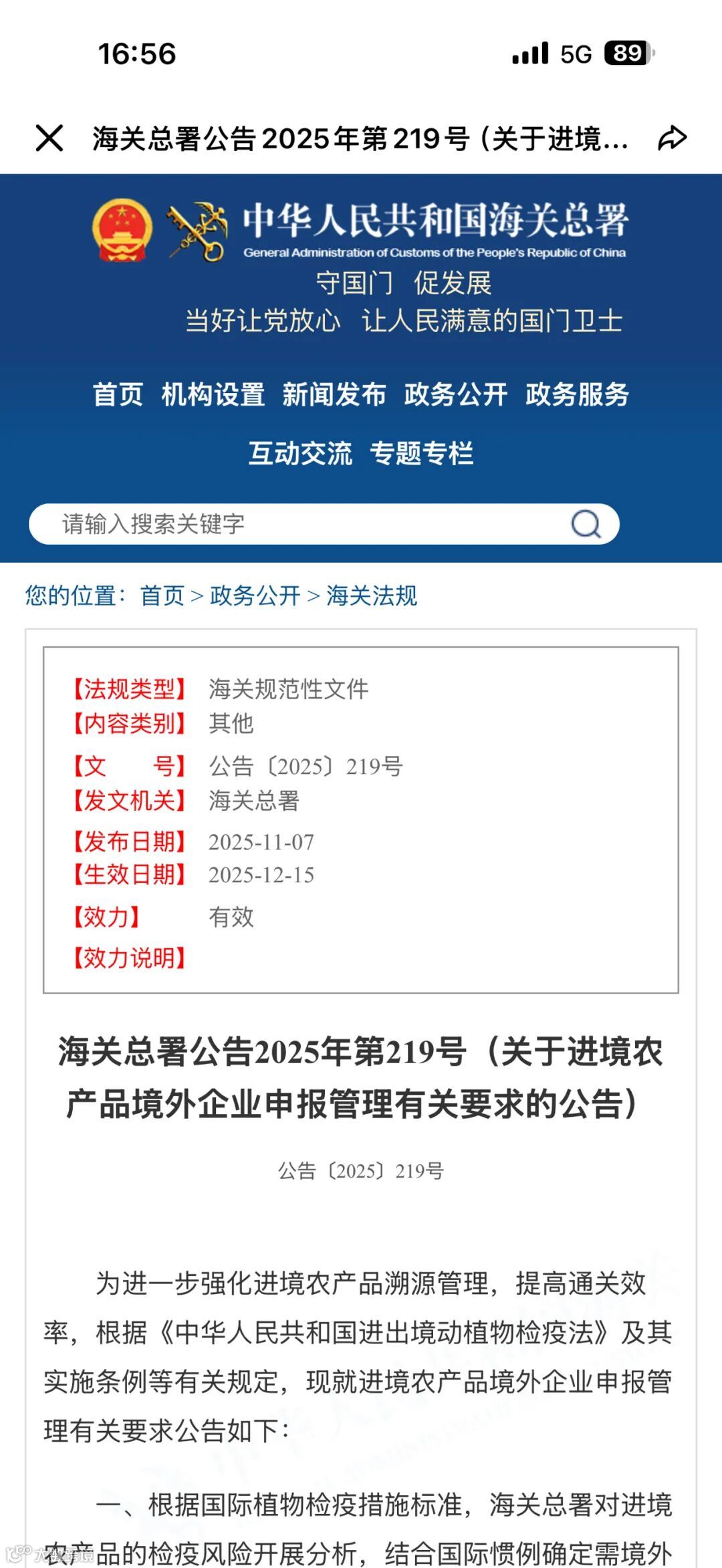 该问题源于海关总署2025年第219号公告《关于进境农产品境外企业申报管理有关要求的公告》于2025年12月15日正式施行。公告对纳入《需官方推荐注册登记的进境农产品目录》的农产品提出了明确申报要求: