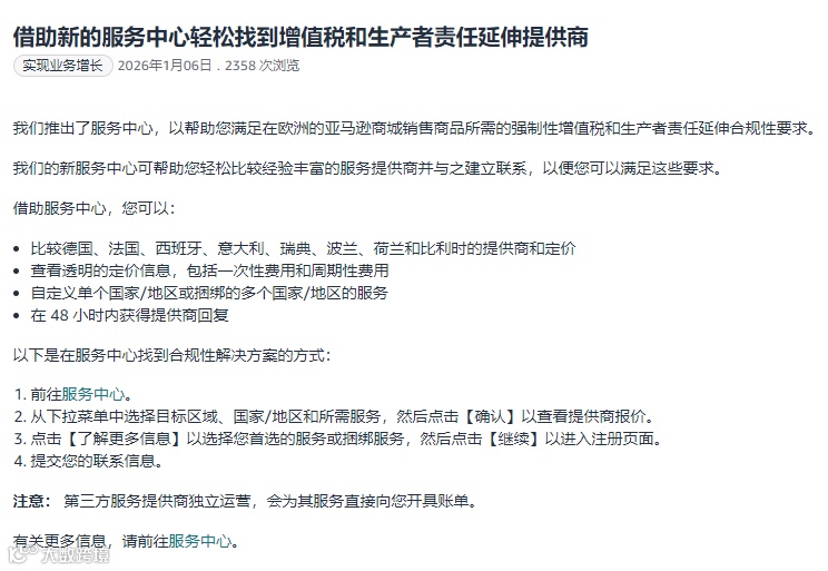亚马逊欧洲站上线“服务中心”,强化VAT与EPR合规支持