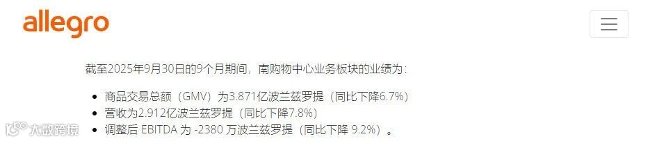 尽管短期利润承压,Allegro董事会指出,剥离Mall South板块有助于消除持续经营亏损,从而提升集团调整后的EBITDA表现。数据显示,在截至2025年9月30日的九个月内,该业务实现收入2.912亿兹罗提(同比降7.8%),GMV为3.871亿兹罗提(同比降6.7%),调整后EBITDA亏损2380万兹罗提(同比收窄9.2%)。