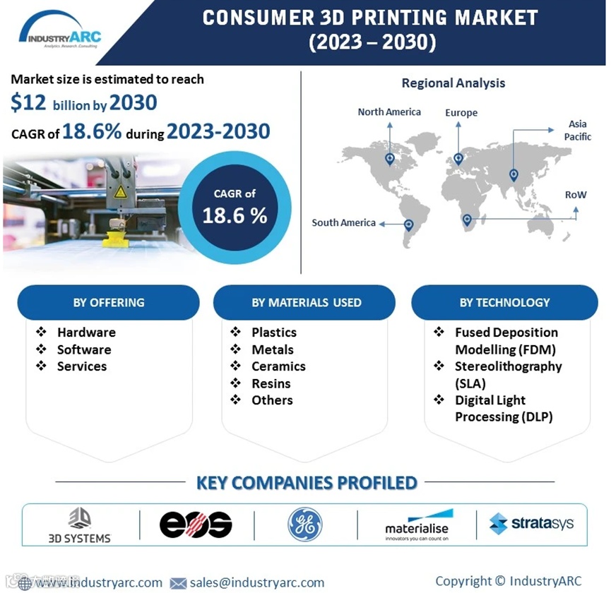 Z世代崛起加速个性化定制需求爆发。Industry ARC《消费3D打印市场报告(2023–2030)》预测:至2030年,全球消费级3D打印市场规模将达120亿美元,2023–2030年复合年增长率18.6%。