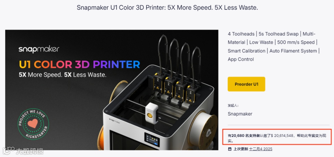 - 2025年下半年,快造科技旗舰产品Snapmaker U1在Kickstarter众筹超2000万美元(约1.5亿元人民币),创全球3D打印项目历史纪录;