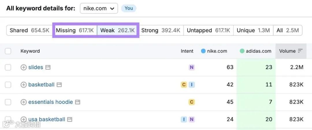 通过Semrush关键词差距工具,对比自身与竞品的关键词覆盖,重点关注: