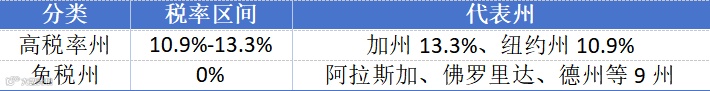 高税率州:加利福尼亚州(13.3%)、夏威夷州(11%)、纽约州(10.9%)