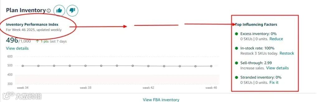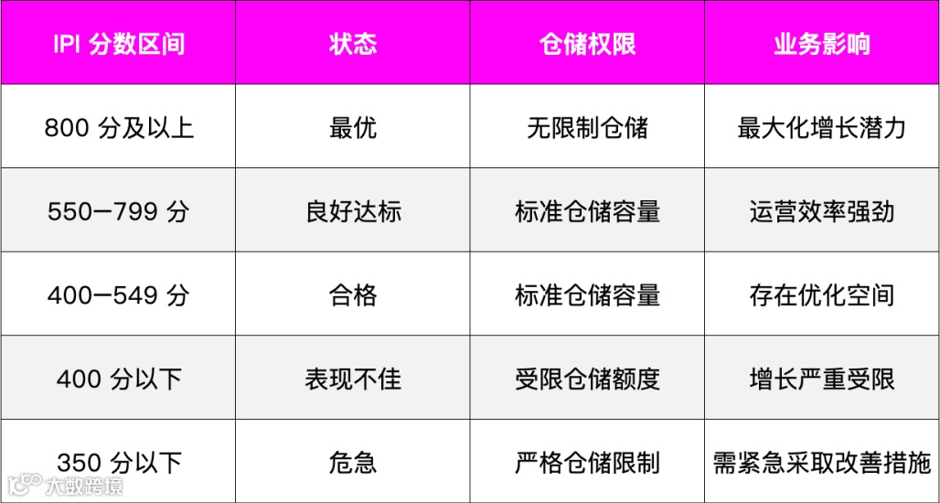 根据亚马逊最新更新,目前最低门槛为 400 分(较往年450分有所降低),大多数卖家的IPI在 400~800 之间。行业专家普遍认为 550+ 是一个良好的IPI分数。如果你的分数低于400分,即使在旺季,也会受到仓储量限制。