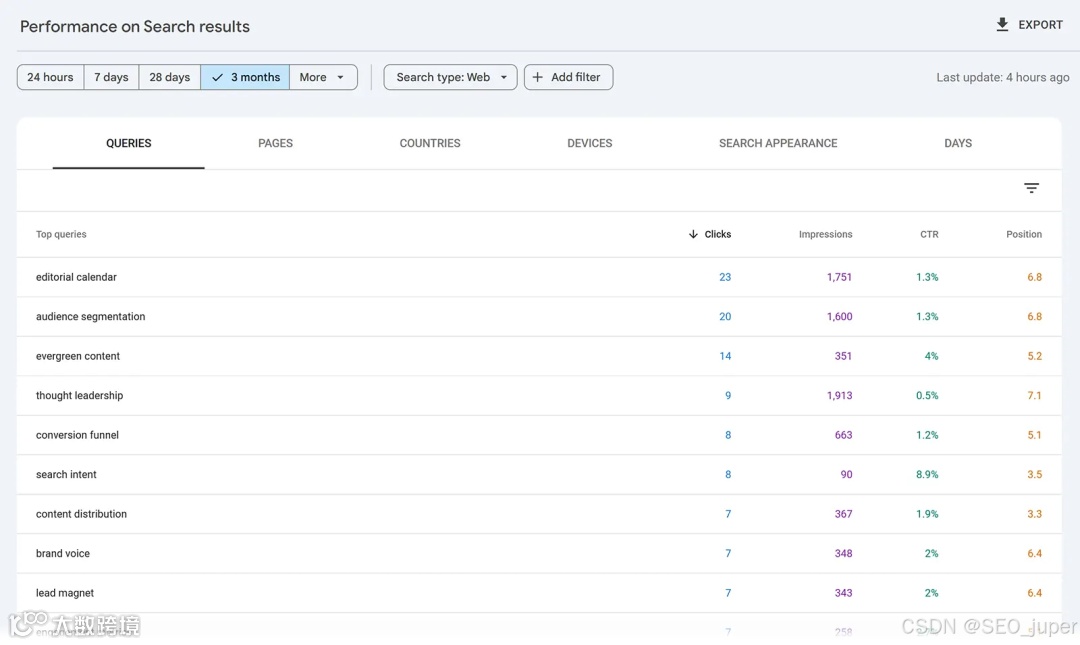 它提供了对展示次数、点击量、点击率以及查询和页面平均排名的可视化。由于GSC数据直接来自谷歌,它是衡量搜索表现的重要参考点。
