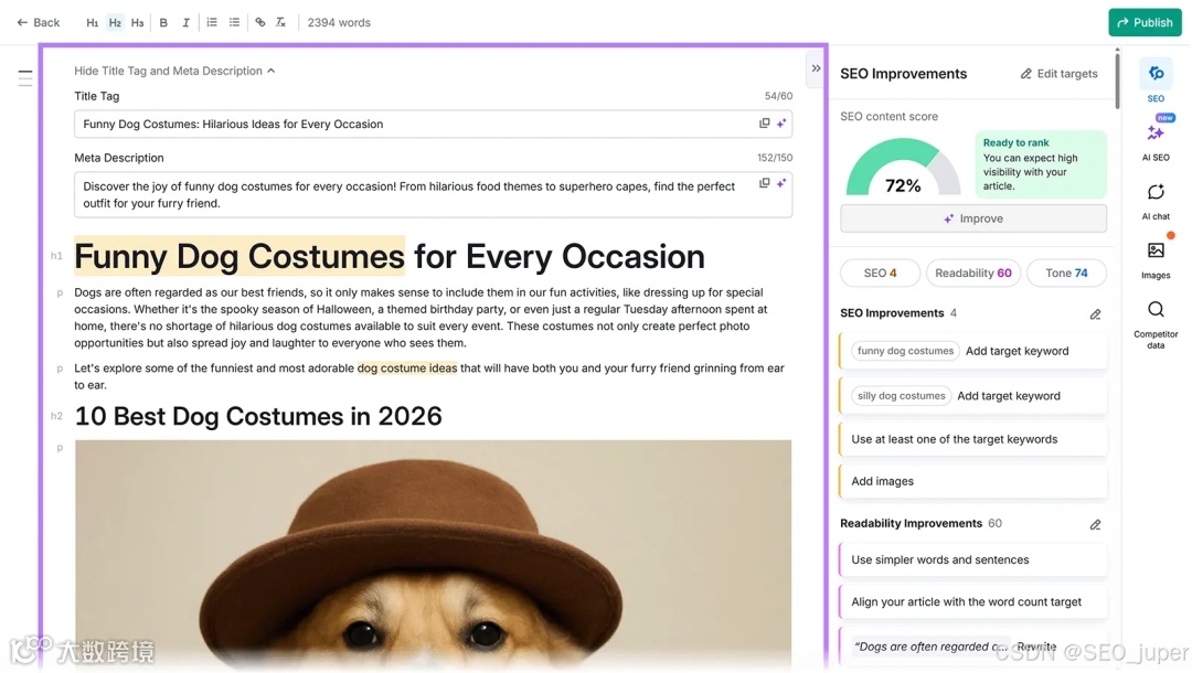 由于草稿是在编辑中生成的,你可以立即精炼内容,应用SEO和可读性建议,并在发布前调整语气。