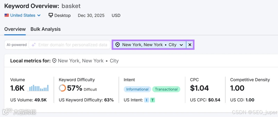 输入关键词后,你会立即看到搜索量、关键词难度、意图和每次点击成本等核心指标。你还可以查看特定国家、地区或城市的数据,这对本地或区域的活动尤其有用。