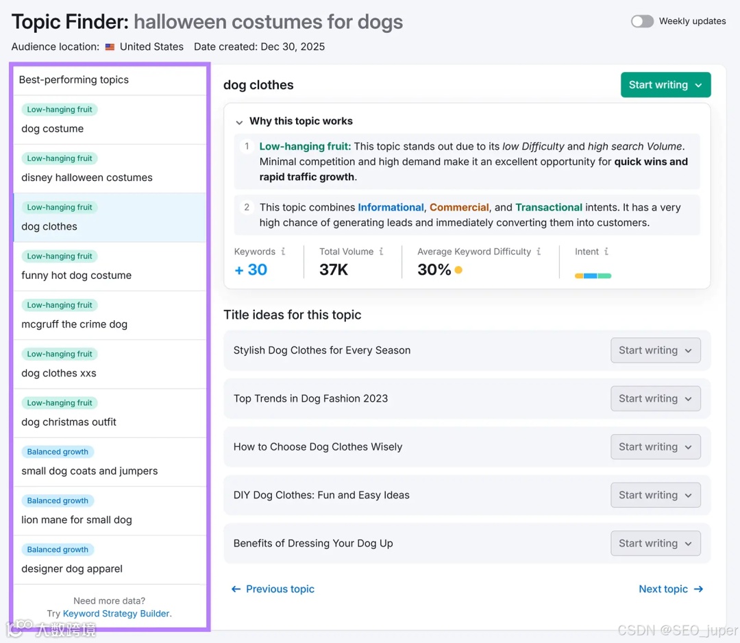 当你输入一个广泛的主题时,主题查找器会自动将相关术语、想法分组到不同主题中,并突出指出每个主题为何值得针对。对于每个主题,你都会看到整体搜索需求、关键词难度、意图以及该主题为何有效的简短说明等洞察。