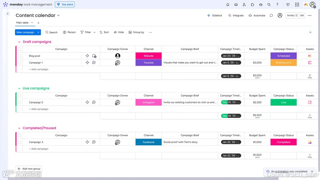 Monday.com 以其强大的自动化功能脱颖而出。例如,你可以设置规则,比如“当任务状态变为审核时,通知任务编辑”或“截止日期前两天发送提醒”。