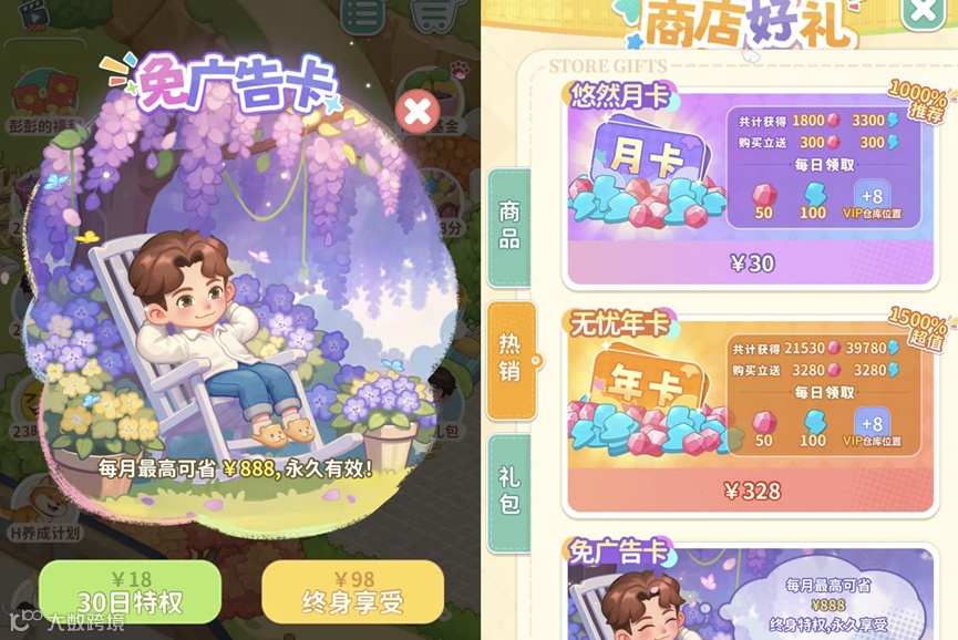 「特权卡」,免广告、月卡/年卡,获得体力和和钻石,可快速获得合成用资源。其中免广告的设计又分为1日体验、30日及终身卡三种,刺激在玩家体验过程中逐步解锁付费。月卡/年卡则刺激玩家中长期活跃,将消耗钻石快速合成目标物品形成一种习惯。