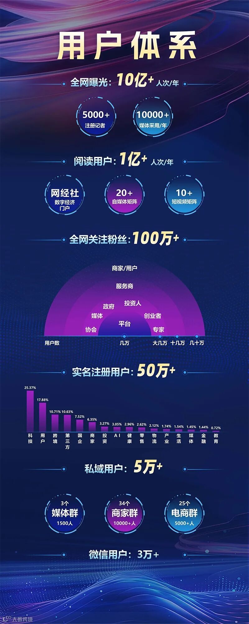 18年积累,网经社构建了以电商为核心的数字经济全产业链用户体系。其中,基于网经社5000+注册记者,10000+媒体采用/年,我们内容全网曝光10亿+人次/年;基于网经社官网(WWW.100EC.CN)、20+个专业台、30+主流自媒体/短视频平台,阅读用户1亿+人次/年。此外,我们全网关注粉丝达100万+;实名注册用户50万+;私域用户5万+;微信用户3万+(电商为主的数字经济相关产、学、研、投、媒、政、企、商家等群体)。