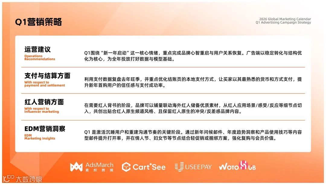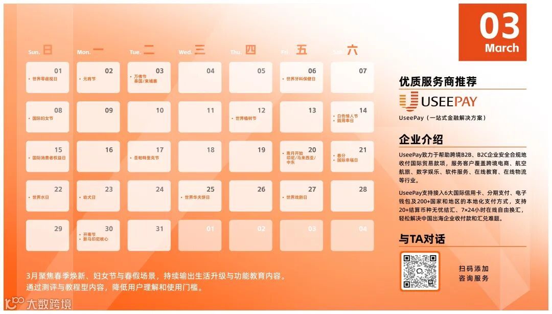 基于这一背景,UseePay携手麦炽跨境AdsMarch、CartSee及卧兔共同编制了《2026全球营销日历》。该日历针对出海与跨境业务领域,对2026年度的关键营销节点进行了系统的整理与归纳,协助各品牌提前构建明确的时间观念与执行框架。