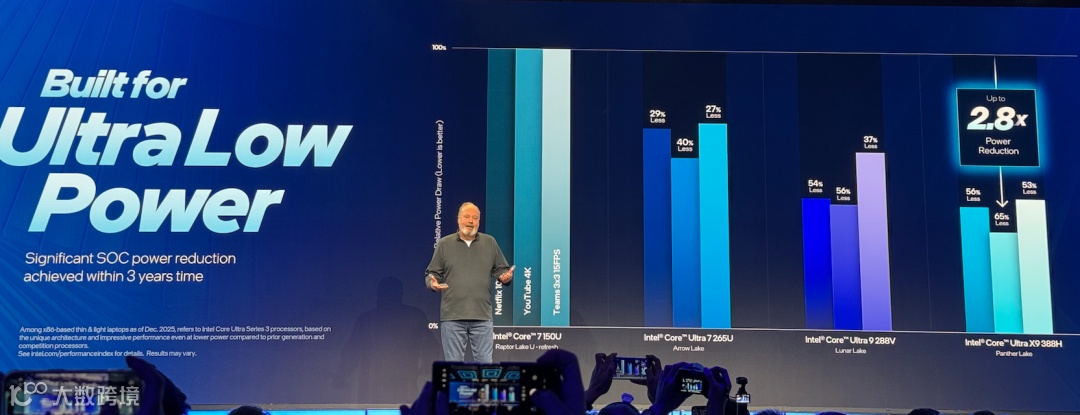 作为采用首款Intel 18A的量产计算平台,第三代酷睿Ultra提升显著,性能提升幅度高达60%,功耗降低40%,可以实现长达27小时的续航时间。