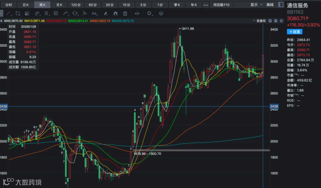 因为各行各业的公司在a股上中都是串联的,本周通信服务行业,上涨了9.5%。这些代表了行业方向之一,说明资金没有切换,还在半导体,在通信里。但是…