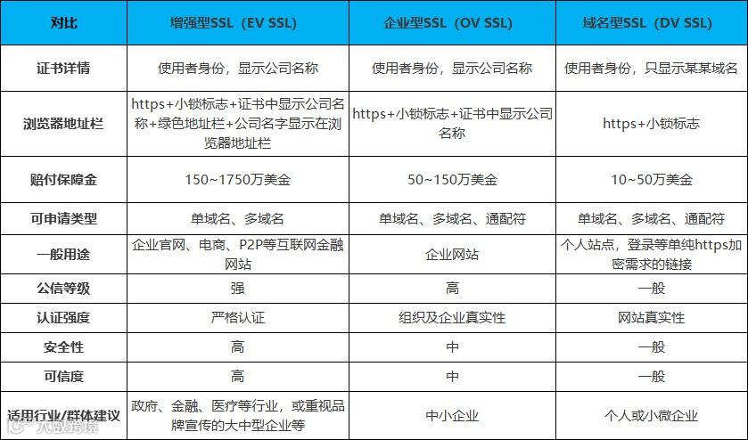 增强型EV SSL证书:这个被认为是现有最安全的证书之一。绿色地址栏显示公司名称+安全锁+https,适用于金融证券、银行、第三方支付、网上商城等,重点强调网站安全和品牌可信形象的网站,涉及交易支付、客户隐私信息和账号密码的传输,建议选择显示绿色地址栏的EV SSL证书,更值得用户信赖。