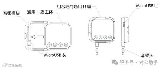 通用盾由两部分组成:左侧为音频模块,右侧为通用盾主体。按箭头方向将主体插入音频模块即可组装成完整设备(见图2)。