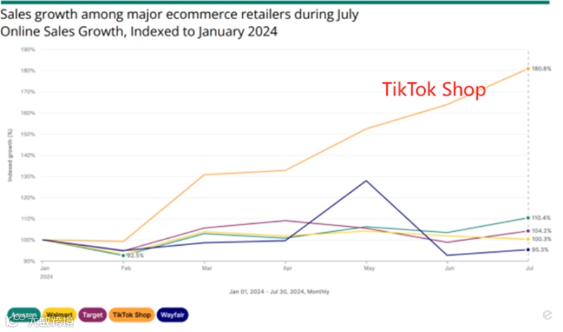 但从增长势头看,TikTok在年终大促中的销售额,对比今年1月增长率达到了80.8%,其增速堪称一骑绝尘。而体量最大的亚马逊增长仅为10.4%。