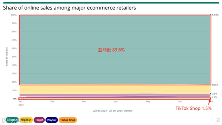 同样由Earnest Analytics针对亚马逊、沃尔玛与TikTok Shop等五大电商平台在美国市场于今年7月(即年中大促)的调查报告来看,亚马逊以83.6%的市场份额遥遥领先,比6月份上升1.6个百分点,而TikTok Shop仅占1.5%。