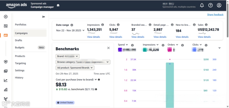 亚马逊广告后台最新推出了名为“Benchmarks(基准)”的功能,被行业喻为“官方透视镜”。该功能目前主要支持SB(品牌推广广告)和SD(展示型推广广告),旨在为卖家在广告复盘与优化过程中,提供来自官方的、直观的类目横向数据对标参考。