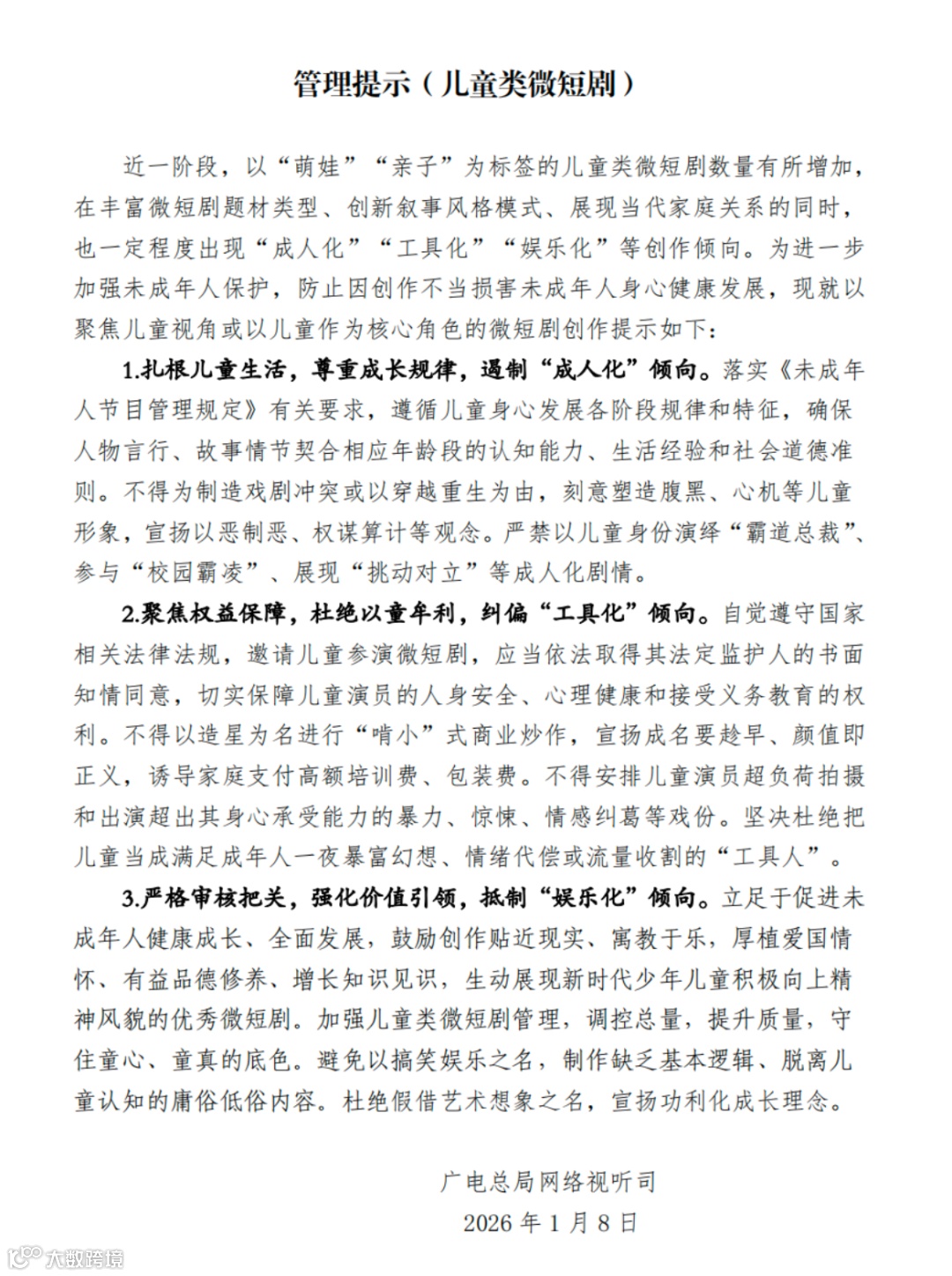 1 月 8 日下午,国家广电总局网络司正式发布 2026 年首个行业管理提示 ——《儿童类微短剧管理提示》,从内容导向、价值传递及从业者权益保障三大维度划定行业红线与发展方向,为快速兴起的儿童类微短剧市场树立明确规范。