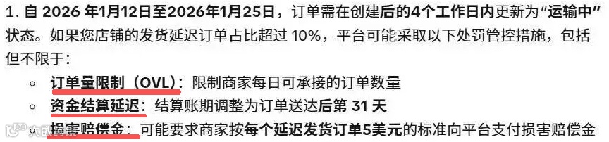 2026年刚开年,TikTok Shop美区卖家交流群炸开了锅。一条新规像投入平静湖面的巨石——从1月26日起,订单必须在48工作小时内进入“运输中”状态,否则面临限流、延迟结算,甚至每单罚款5美元。