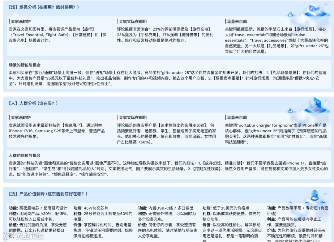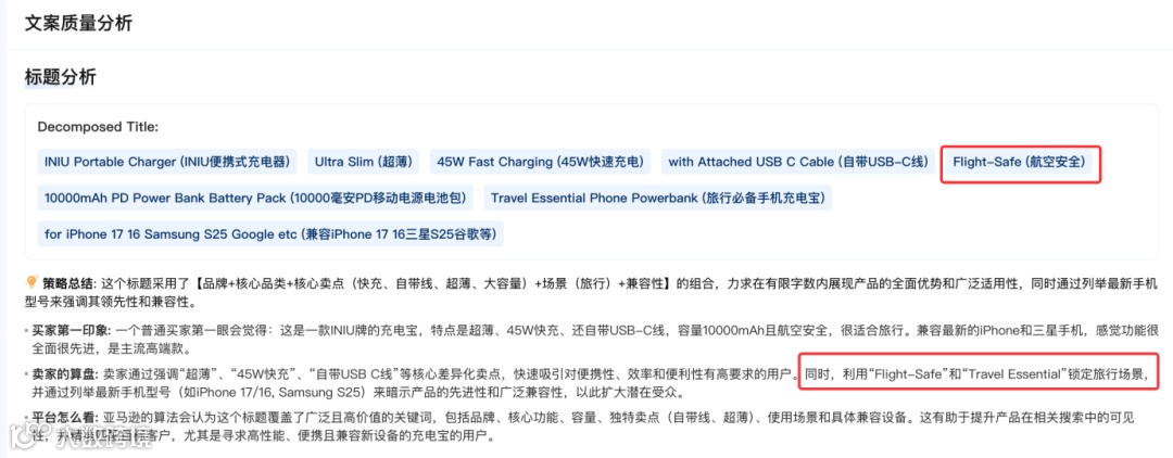 虽然其核心大词是Portable Charger,但报告显示,其Listing极度强调 Travel Essential(旅行必备)和 Flight-Safe(航空安全)。通过锁定旅行这一高频刚需场景,避开了与科技极客的参数纠缠,直接收割了那批只求出门不断电的实用主义者。