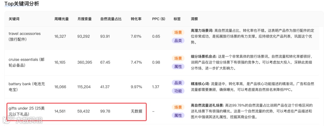 报告显示关键词Gifts under 25拥有极高的自然搜索量和转化潜力。但是INIU作为一个颜值高、单价适中的产品,INIU竟然完全没有在文案、图片或包装上针对送礼场景做任何优化。这是使用场景或者说流量,却被白白丢弃。