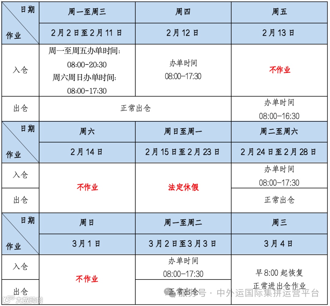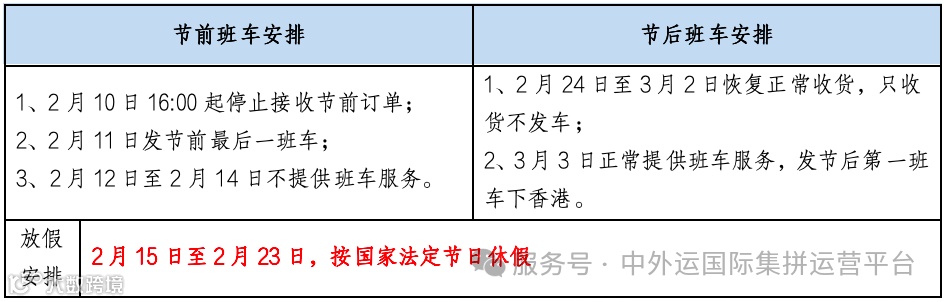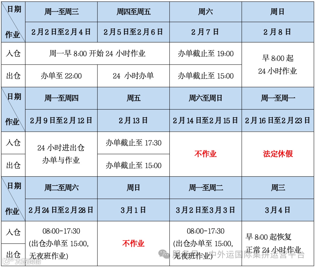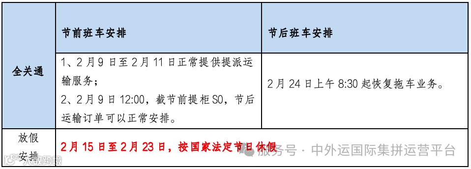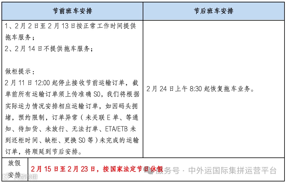 中外运国际集拼运营平台2026年春节假期期间的工作安排通知如下: