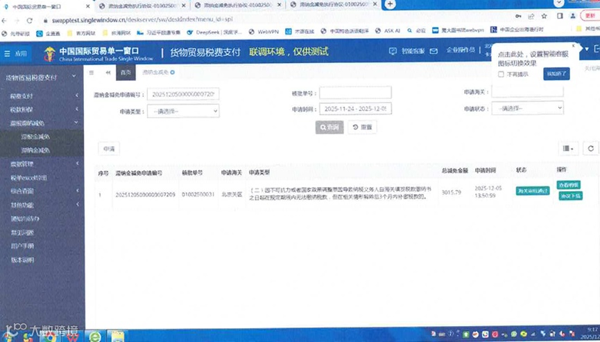 为进一步优化税款滞纳金减免流程,便利纳税人办理手续,自2025年12月24日起,海关税款滞纳金减免无纸化应用上线运行,实现业务全流程线上办理。