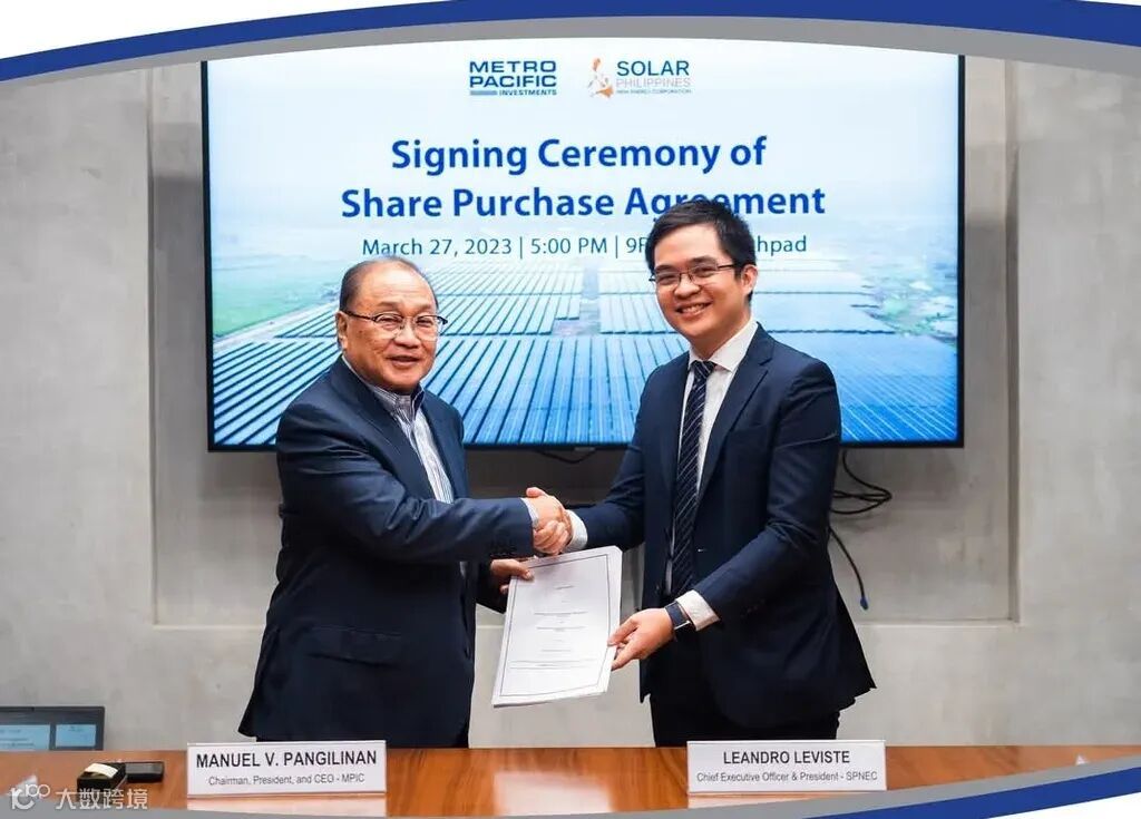 交易达成。2023年3月27日,Metro Pacific Investments Corp. (MPIC) 董事长、总裁兼首席执行官 Manuel V. Pangilinan(左)与时任 SP New Energy Corp. 首席执行官兼总裁 Leandro Leviste 签署股份购买协议,MPIC 由此成为 SPNEC 的最大单一股东。SPNEC 是菲律宾太阳能发电项目的开发商、所有者和运营商