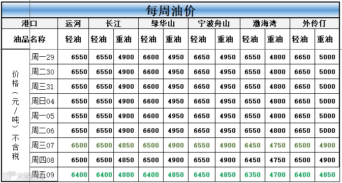 本周外港轻油、重油价格均呈下行趋势,轻油累计下跌约200元/吨,重油下跌约100元/吨。具体价格详见下表。