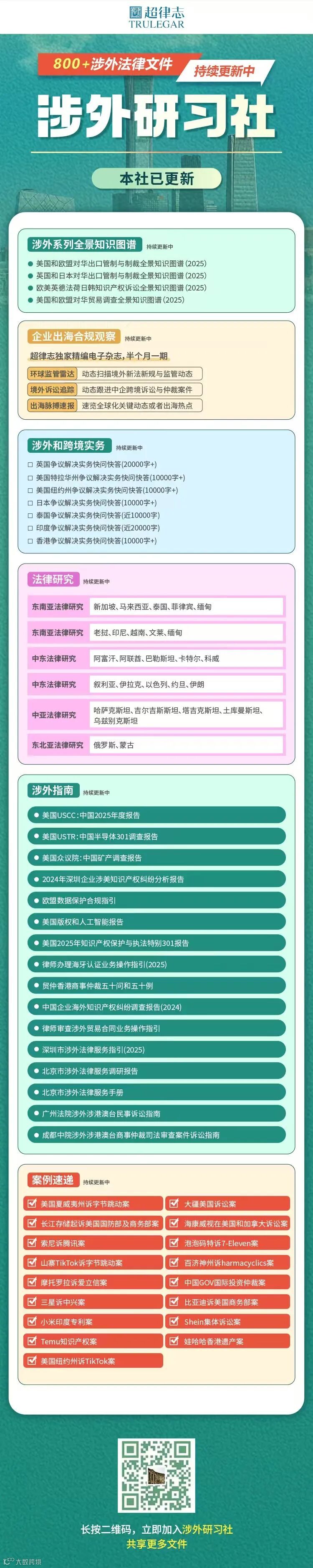1. 资源整合需求:涉外法律信息分散,一手诉讼文件与政策原文获取难度大。本研习社专注系统化采集、整理并持续更新全球重点司法辖区最新法律文件。