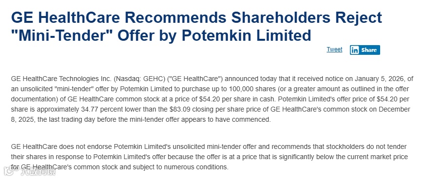 近日,GE医疗发布公告称,于2026年1月5日收到Potemkin Limited发出的未经邀请的“小额收购”要约:拟以每股54.20美元现金价格,收购最多10万股GE HealthCare普通股(约占流通股总数的0.022%)。